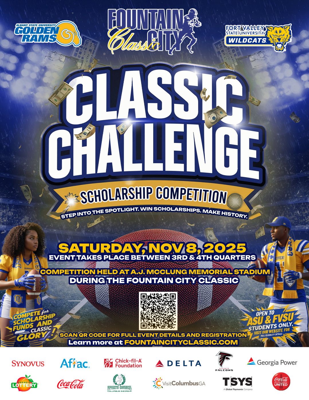 7:00 P.M. – 9:00 P.M. – FCC Chairman’s Reception Honoring ASU President Dr. Robert Scott; Kiersten Jones, Miss ASU & Brison Williams, Mister ASU. FVSU President Paul Jones; Jordan Gallemore, Miss FVSU & Demar Richards, Mister FVSU; Columbus Trade Center, 801 Front Avenue, Ballroom “B & C”. Festive and Business Attire. Invitation Only.