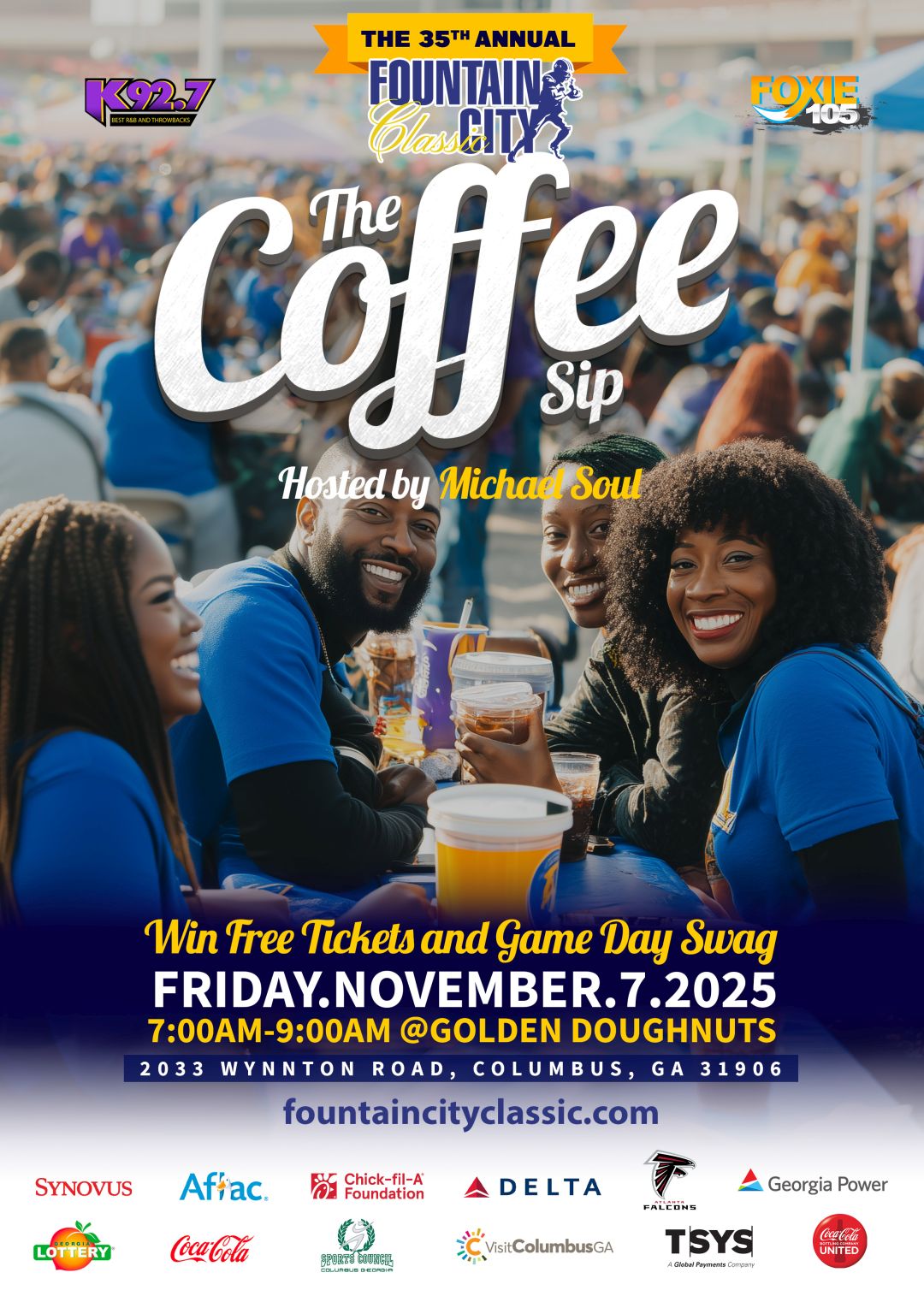 7:30 A.M. – 10:30 A.M. – Kick-off the FCC Weekend at the FCC Coffee Sip @ Golden Doughnuts 2033 Wynnton Road. Live Remote with Foxie 105 & K92.7 with Michael Soul in the Morning Drive, Prizes & Giveaways!!! Join Us!