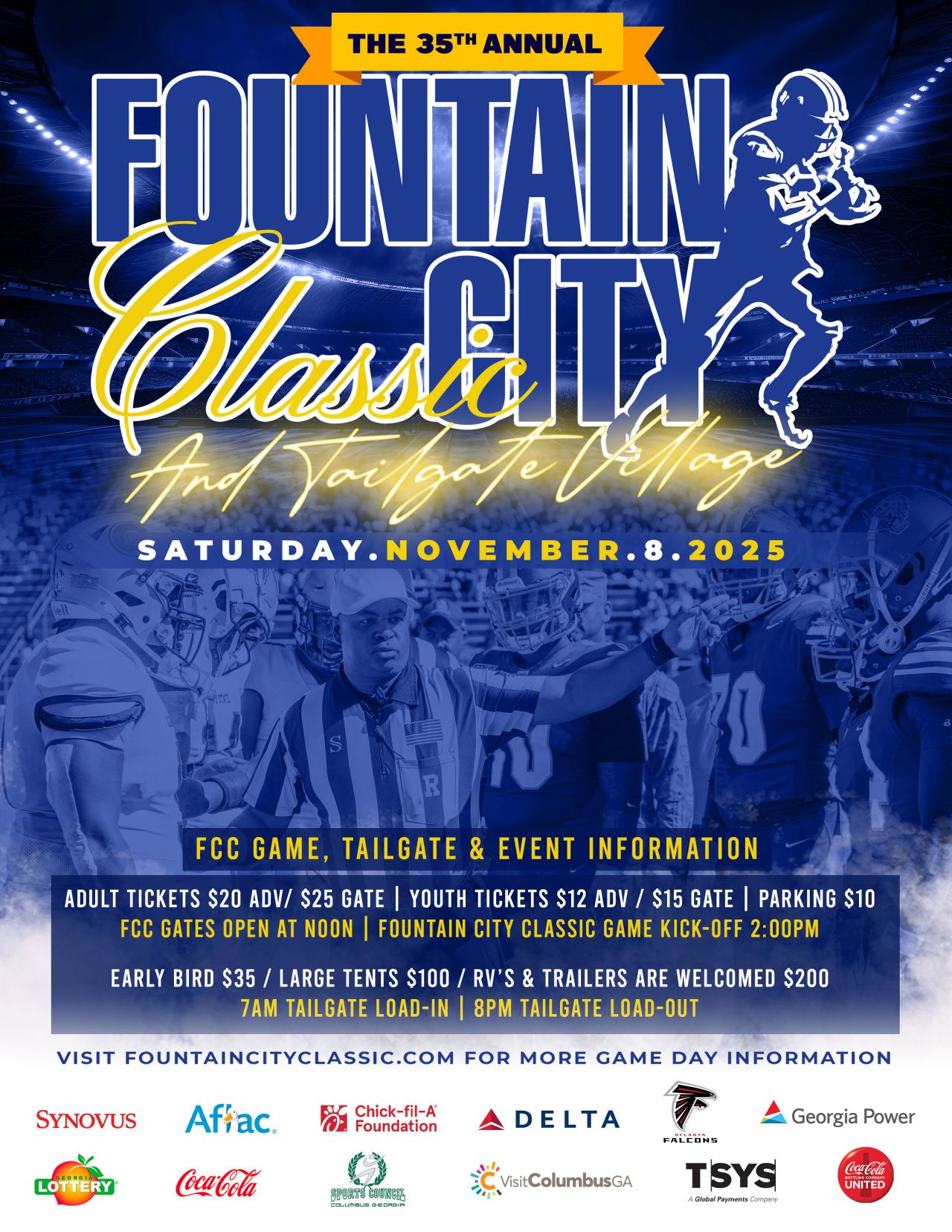 The Fountain City Classic The Fountain City Classic Host Committee welcomes you to the best tailgating in southwest Georgia! Immerse yourself in the ultimate game day rivalry and celebration at the Fountain City Classic’s Tailgate Experience on Saturday, November 8, 2025. Get ready for an electrifying atmosphere filled with camaraderie, delectable cuisine, and thrilling activities. Mark your calendars – tailgate registration kicks-off on Sunday, September 7th at 12 noon, secure your exclusive access to the festivities. Hurry as registration to secure your tailgating spot concludes on Sunday, October 26th at midnight. Don’t miss your chance to be part of the most exciting tailgating experience in southwest Georgia!